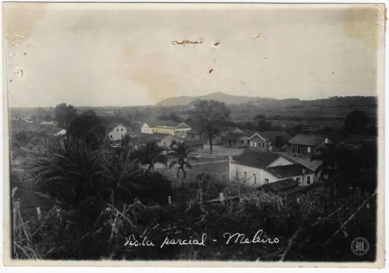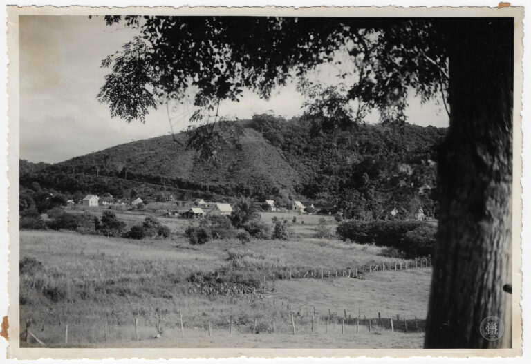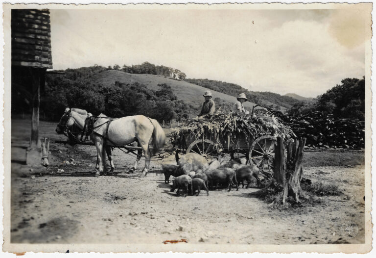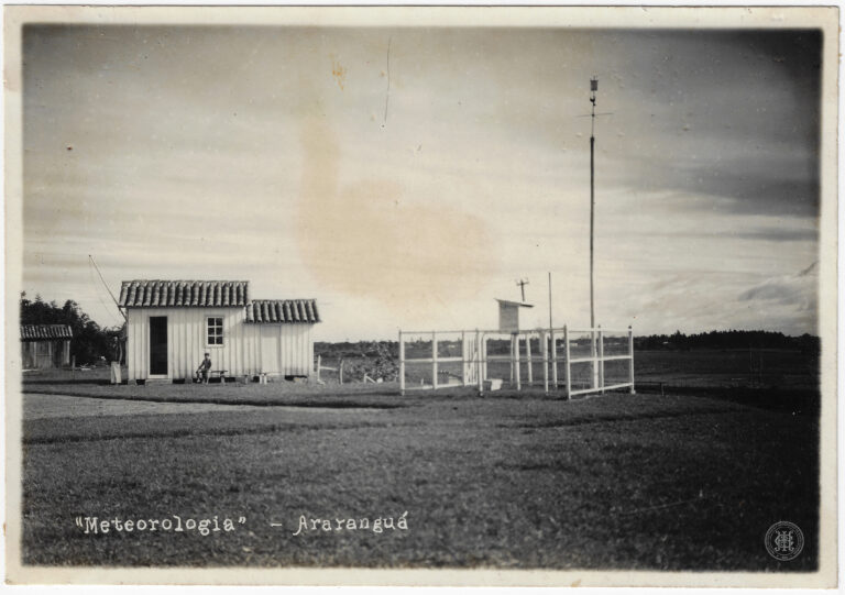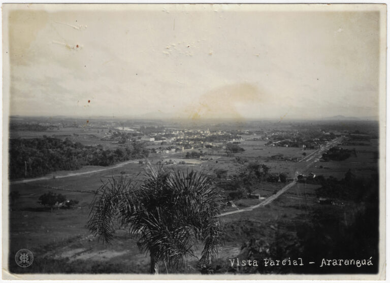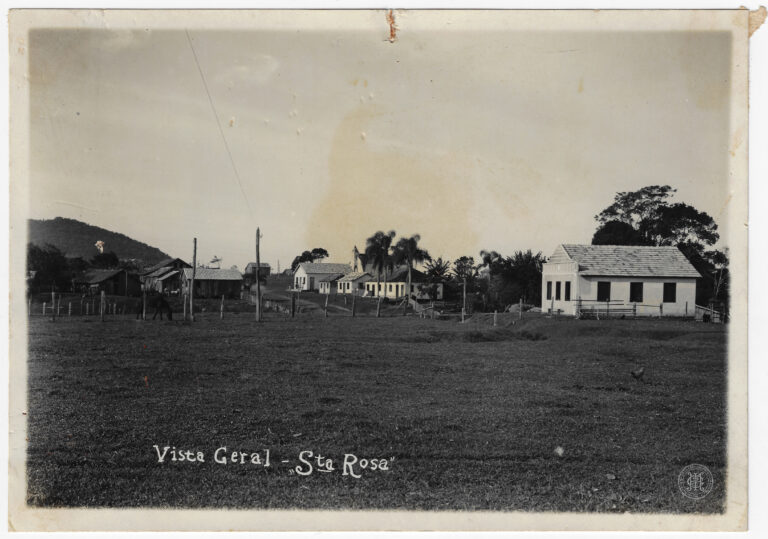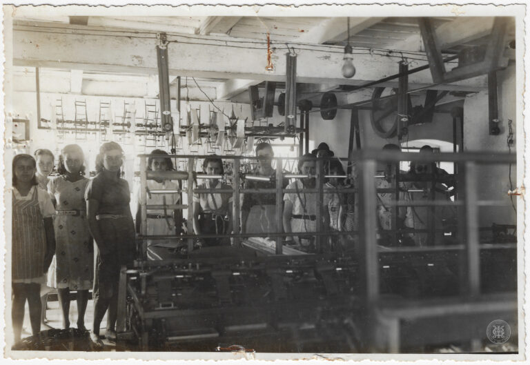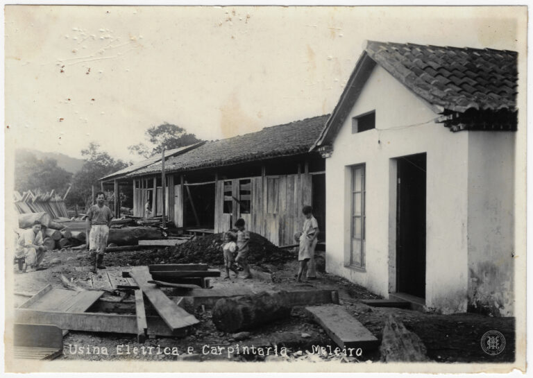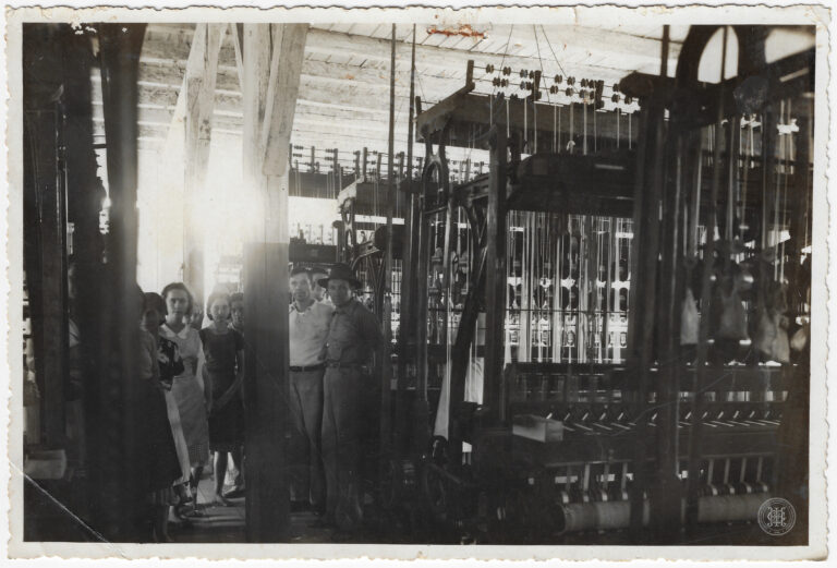 Vista interna da fábrica de fitas de seda de Otto Schaefer em Brusque, Santa Catarina. A composição organiza-se com um grande conjunto de maquinário têxtil industrial ocupando todo...