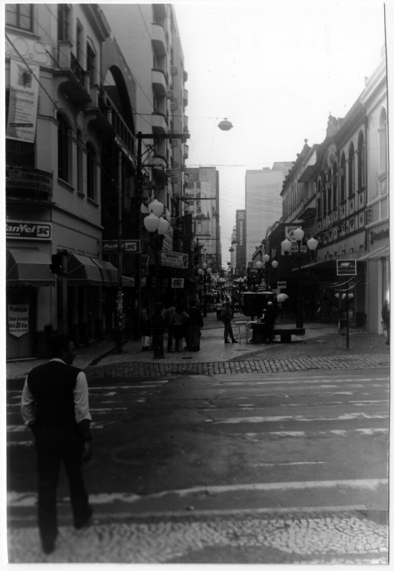 Esta fotografia registra um trecho urbano da Rua Felipe Schmidt, no Centro de Florianópolis, Santa Catarina, no ano de 1996. A imagem apresenta uma perspectiva central profunda, capturada...