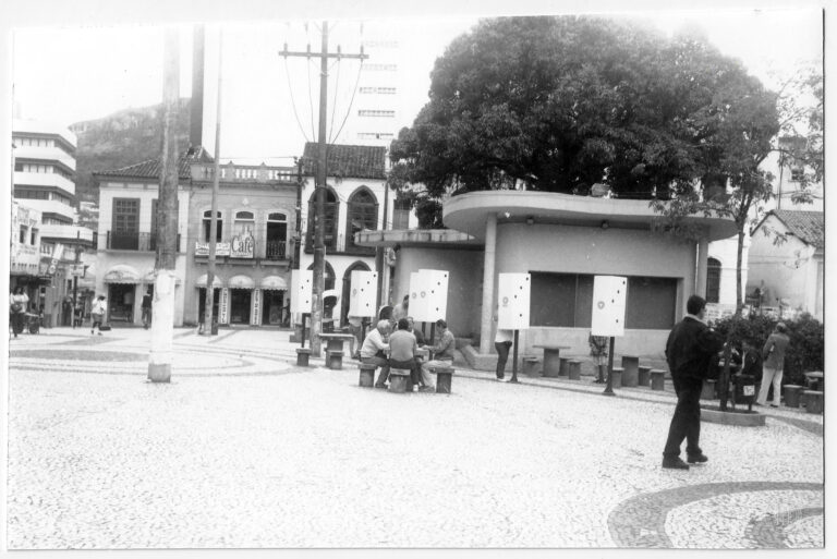 Esta fotografia registra uma cena urbana no Largo da Catedral Metropolitana de Florianópolis, em 1996. Em primeiro plano, observa-se o calçamento em mosaico português com desenhos geométricos e...
