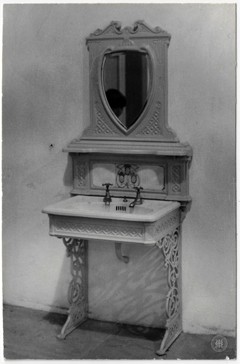 Esta fotografia apresentado como uma peça de acervo em ambiente interno. O objeto, de estrutura metálica e louça, destaca-se por sua composição artística: a base é formada por...