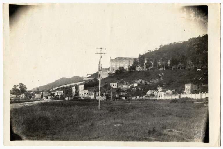 Vista panorâmica da Colina do Menino Deus e do antigo Bairro da Toca (atual Prainha), em Florianópolis, Santa Catarina, no início do século XX. A composição organiza-se com...