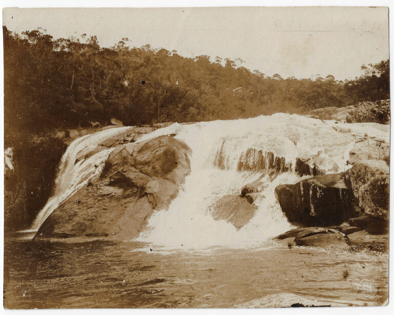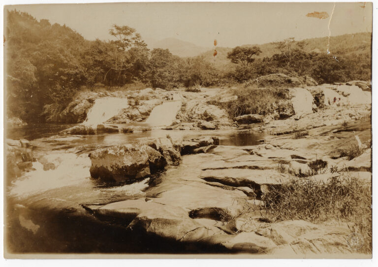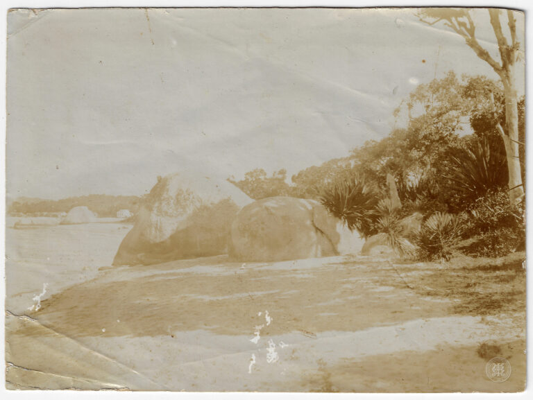Paisagem costeira com formações rochosas em Florianópolis, Santa Catarina. No primeiro plano, observa-se uma faixa de areia ou solo claro que conduz a duas grandes rochas arredondadas (matacões)...
