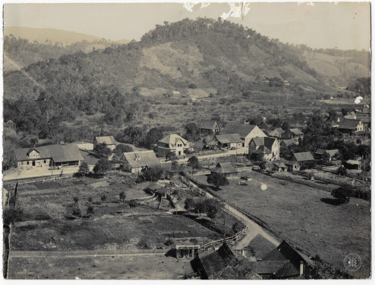 by Eugenio Pelegrin Leia Mais...Vista aérea oblíqua de uma colônia rural em Santa Catarina, organizada em torno de uma via central. No primeiro plano, observa-se a infraestrutura de pequenas propriedades, incluindo telhados...