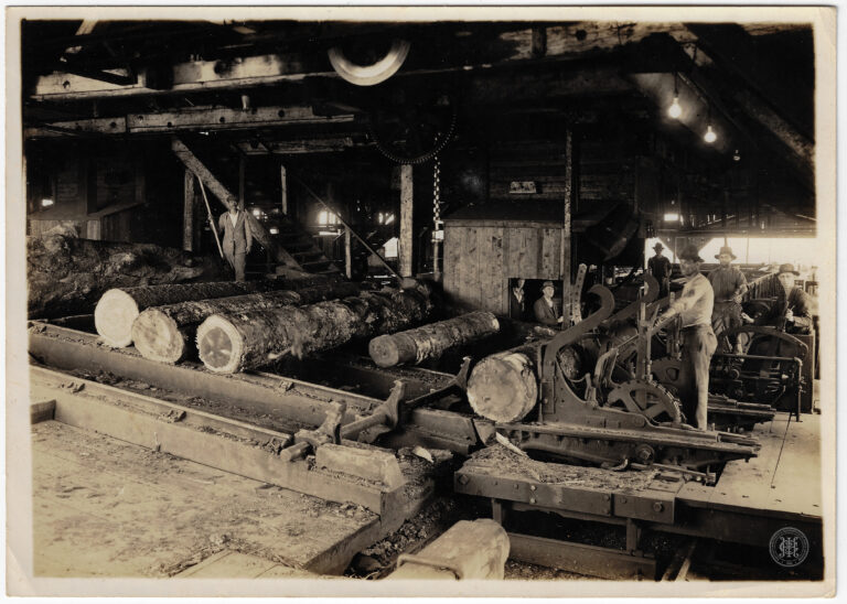 Interior de uma serraria em plena atividade
