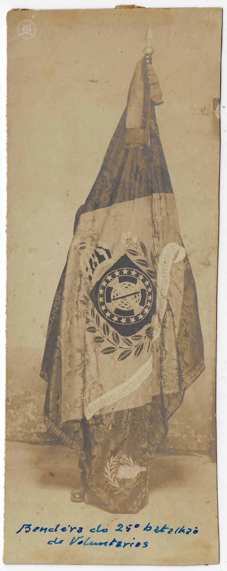 Registro frontal da Bandeira do 25º Batalhão de Voluntários Catarinenses, utilizada durante o período Imperial. A peça têxtil é composta por um campo escuro com uma bordadura decorativa...