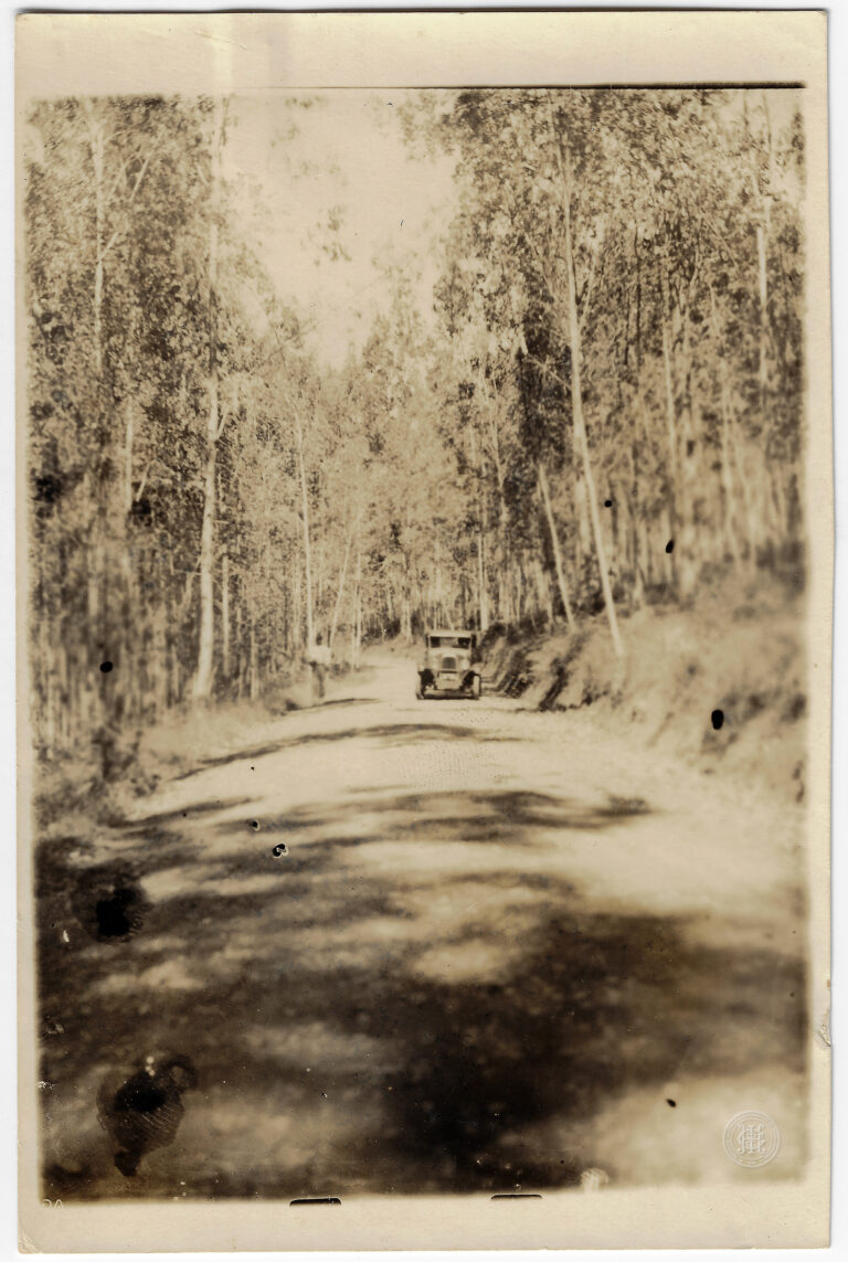 Estrada de terra que atravessa uma densa plantação de eucalipto em Orleans, Santa Catarina. A composição é estruturada com a estrada em primeiro plano, apresentando uma superfície irregular...