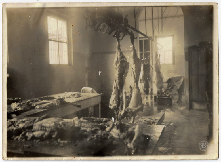 Interior da sala de xarquear da Fábrica de Produtos Suínos de Cabral & Irmão, localizada em Orleans, Santa Catarina. A composição é organizada em planos distintos que evidenciam...