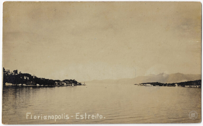 Esta fotografia oferece uma vista panorâmica do canteiro de obras do 14° Batalhão de Caçadores (atual 63° Batalhão de Infantaria), no bairro Estreito, em Florianópolis. A imagem organiza-se...