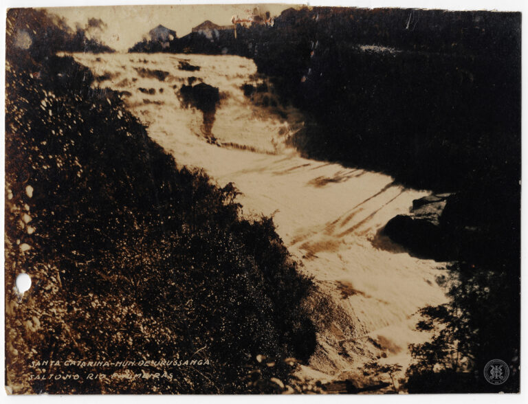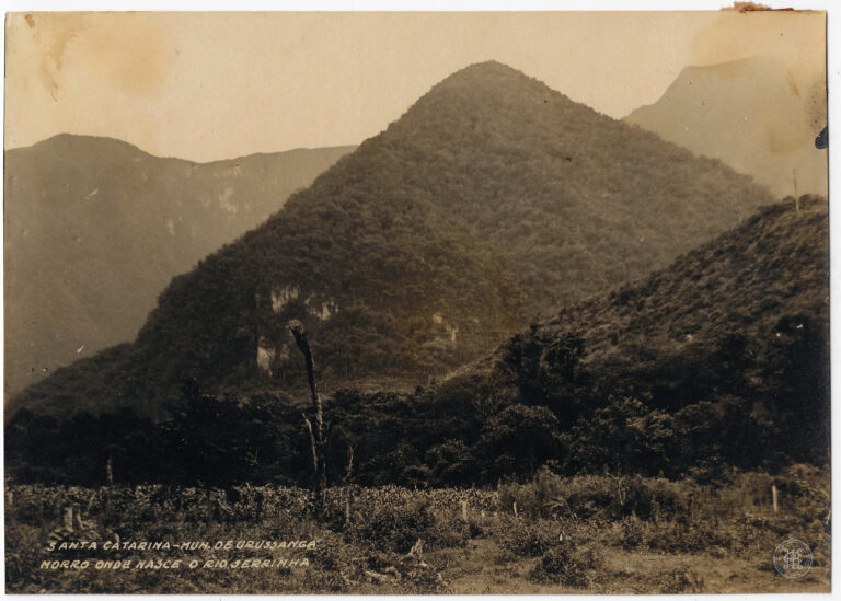 Fotografia apresentando a entrada de um túnel ferroviário em Santa Catarina. A composição é estruturada a partir da linha férrea que surge no primeiro plano inferior e conduz...
