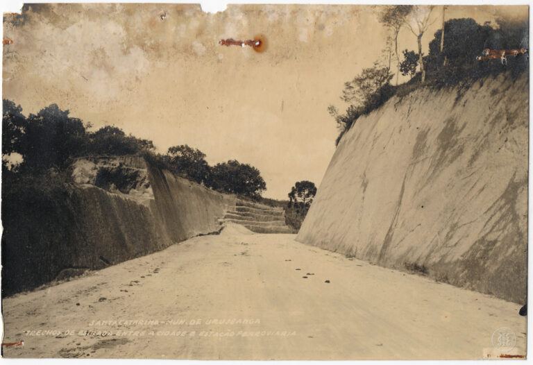 by Eugenio Pelegrin Leia Mais...Trecho da estrada de rodagem que conectava o centro urbano à estação ferroviária em Urussanga, Santa Catarina. A composição apresenta uma via de terra batida que corta diagonalmente...