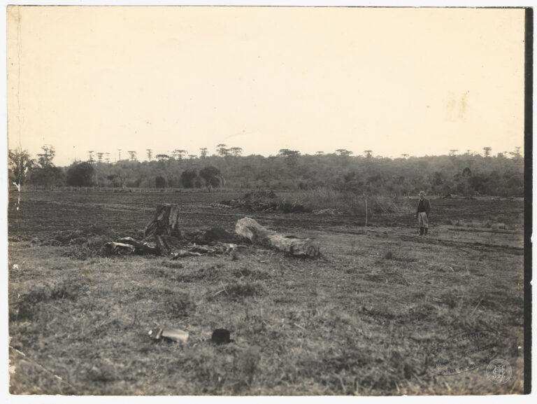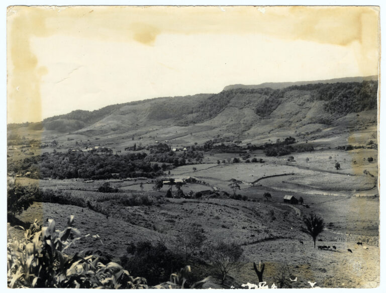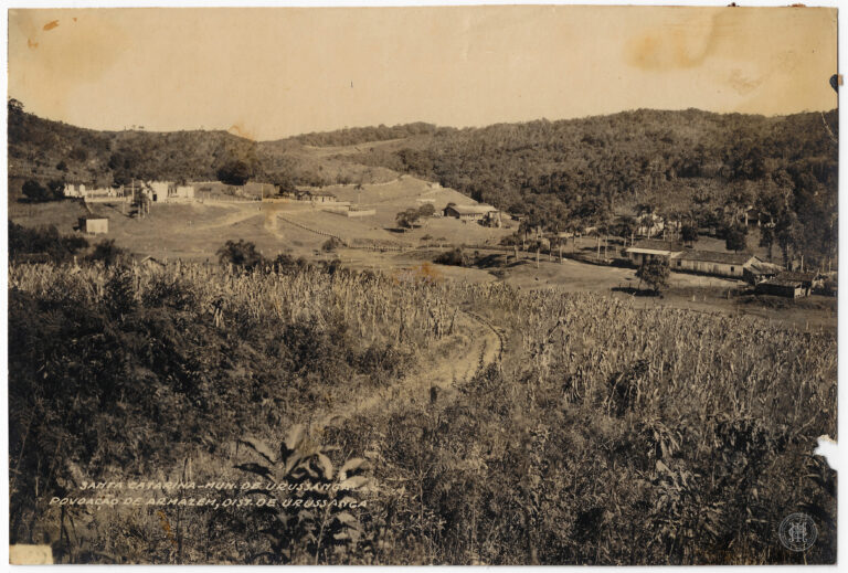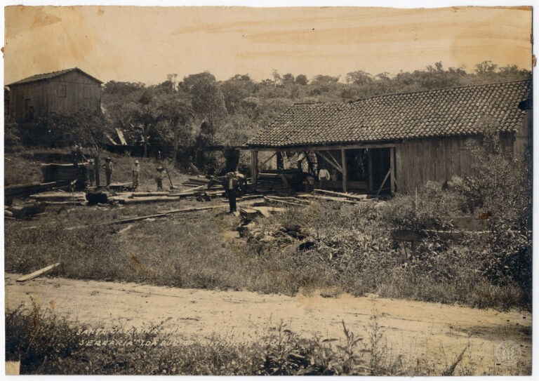 Fase de construção do matadouro da Vila de Cocal, no município de Urussanga, Santa Catarina. A imagem destaca, em plano médio, uma extensa edificação de alvenaria de tijolos...