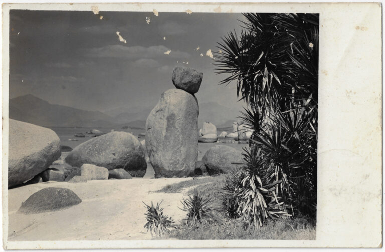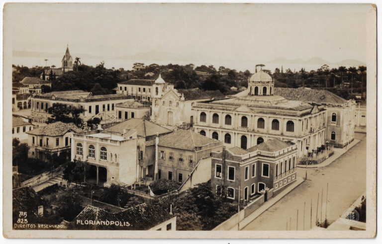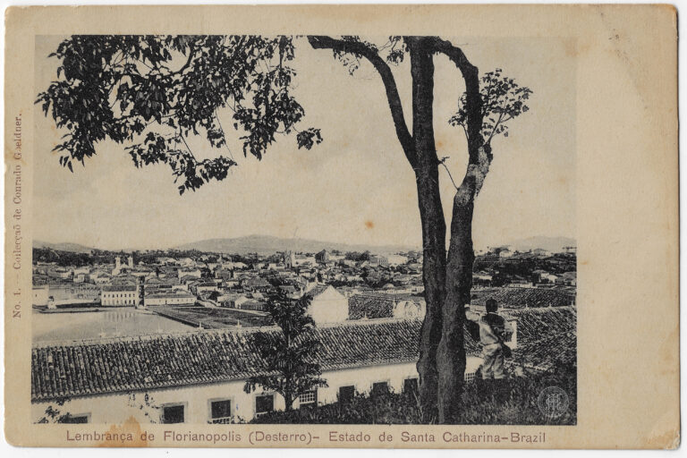 Esta fotografia, em formato de cartão-postal, apresenta uma vista panorâmica elevada da cidade de Florianópolis, então denominada Desterro, no estado de Santa Catarina. No primeiro plano, à direita,...