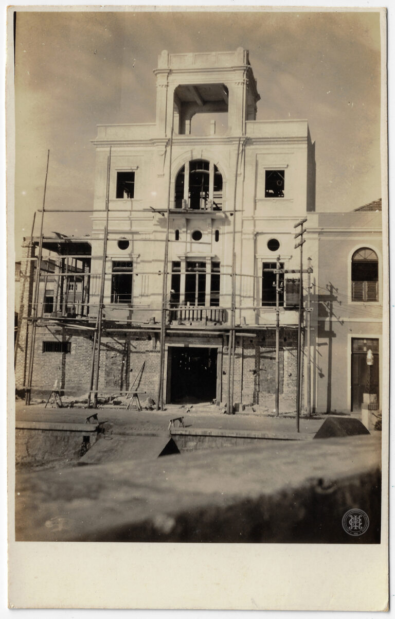 Esta fotografia registra a fachada em construção da primeira sede do Clube Náutico Francisco Martinelli, em Florianópolis, Santa Catarina. A imagem organiza-se com um elemento arquitetônico em primeiro...