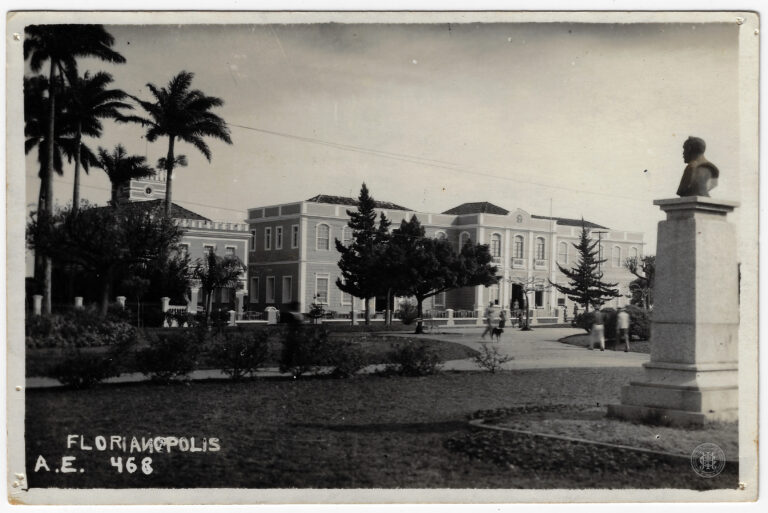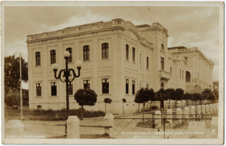 Fachada e a perspectiva lateral do Instituto Polytechnico em Florianópolis, Santa Catarina, no ano de 1925. A edificação de dois pavimentos apresenta estilo arquitetônico eclético, com ornamentos em...