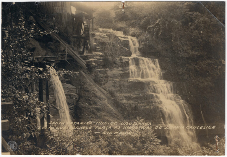 by Eugenio Pelegrin Leia Mais...Salto d’água no Rio Maior, em Urussanga, Santa Catarina, utilizado para o fornecimento de energia às indústrias de J. Maria Cancelier. A imagem destaca, no plano médio e...