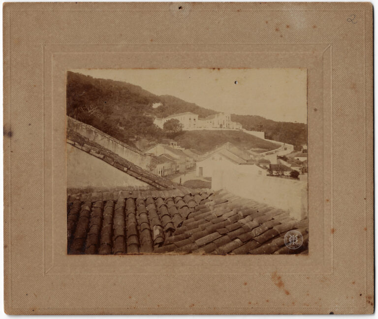 Esta fotografia, montada sobre um suporte de cartão texturizado de cor parda, registra uma vista urbana de Florianópolis a partir de um plano elevado, focando no Menino Deus...
