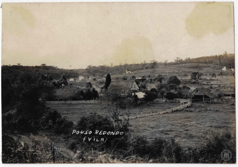Vista panorâmica da Vila de Pouso Redondo, em Santa Catarina. A composição organiza-se com um terreno gramado e cercas de madeira em primeiro plano, que conduzem o olhar...