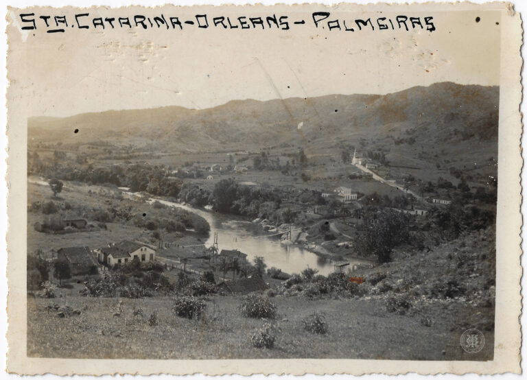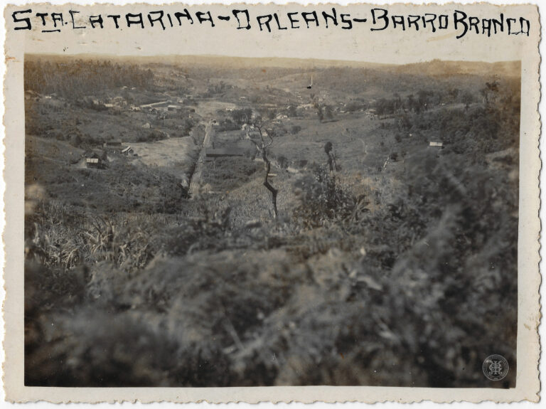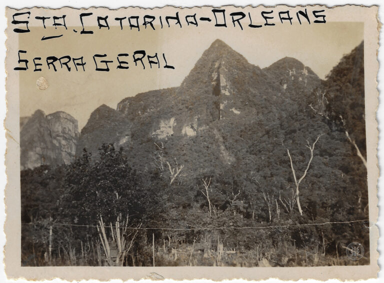 Vista de formações rochosas escarpadas na Serra Geral, em Orleans, Santa Catarina. A imagem organiza-se com uma vegetação densa e variada em primeiro plano, destacando-se folhagens de grande...