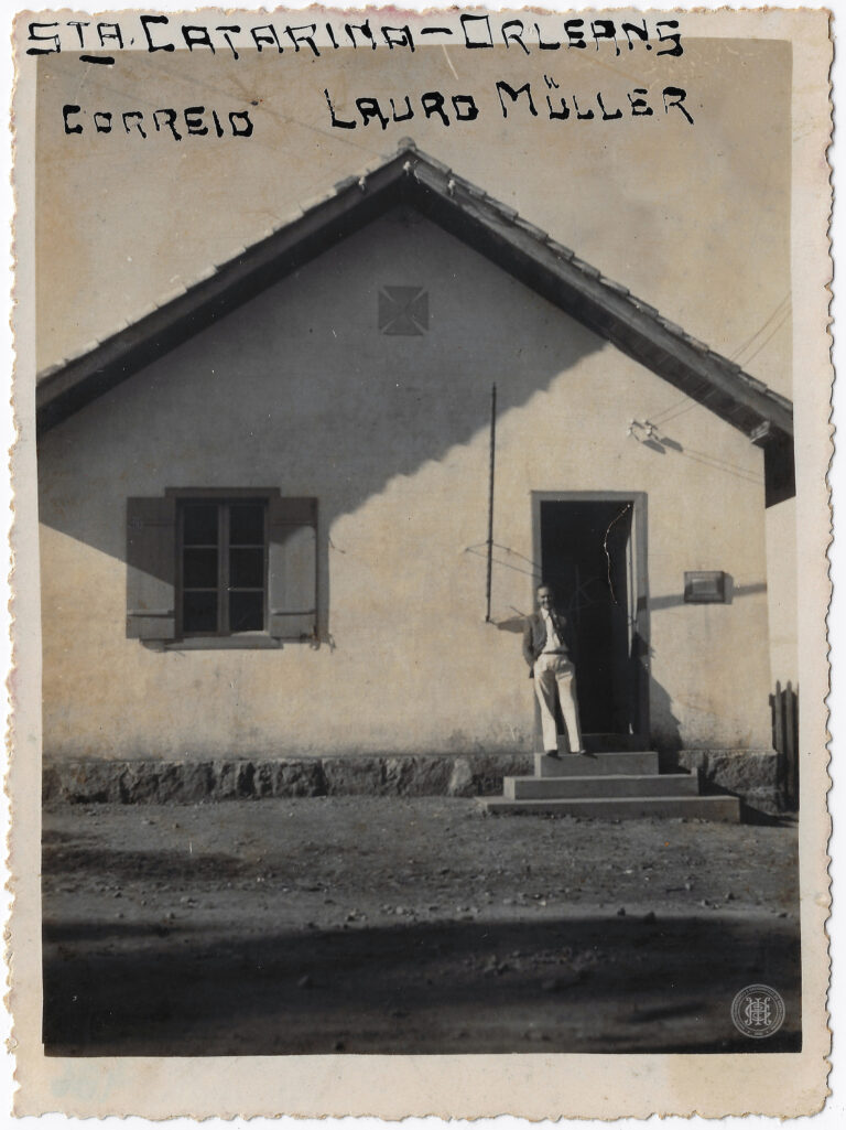 by Eugenio Pelegrin Leia Mais...Edificação do Correio Lauro Müller em Orleans, Santa Catarina. A composição foca na fachada principal de uma construção térrea de alvenaria com telhado de duas águas e base...