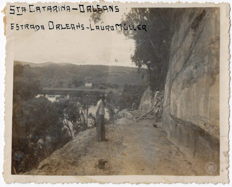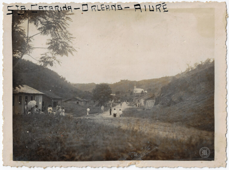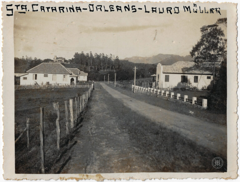 by Eugenio Pelegrin Leia Mais...Perspectiva de uma via pública em Orleans, Santa Catarina, identificada na legenda como Lauro Müller. A composição é dividida por uma estrada de terra batida que conduz o...