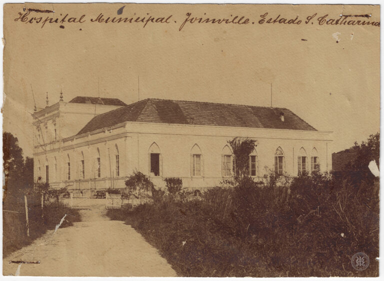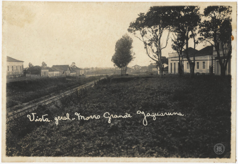 Esta fotografia horizontal em tons de sépia registra a fachada frontal da residência do Sr. Serafim Antônio, localizada na vila de Sangão, no município de Jaguaruna, Santa Catarina....