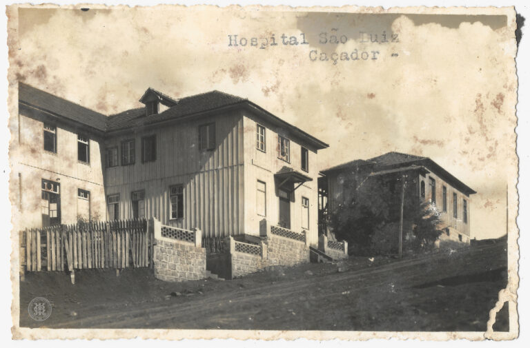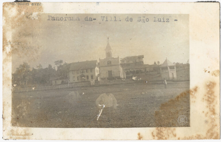 Ponte sobre o Ribeirão Garibaldi, situada no interior de Jaraguá do Sul, Santa Catarina, datada de 1939. Em primeiro plano, observa-se o leito de um rio raso e...