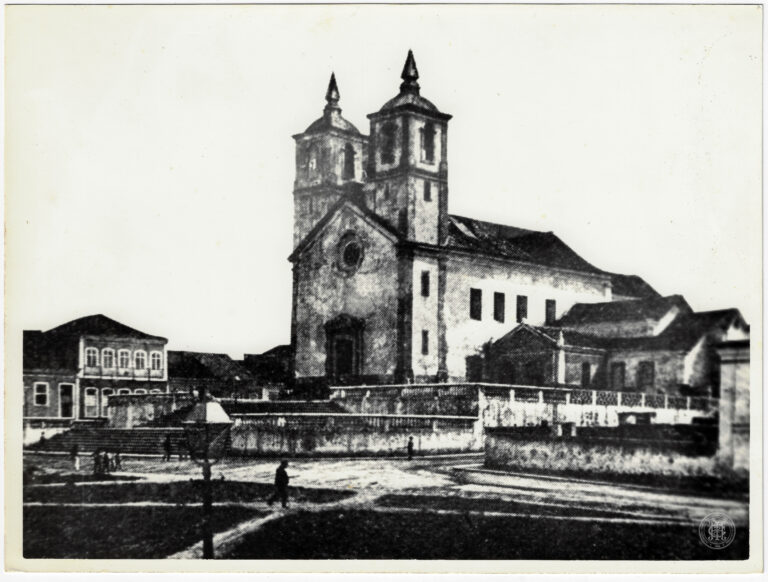 Esta fotografia registra a fachada frontal e a lateral direita da Catedral Metropolitana de Florianópolis, identificada na legenda como “A matriz”, em um registro datado do final do...