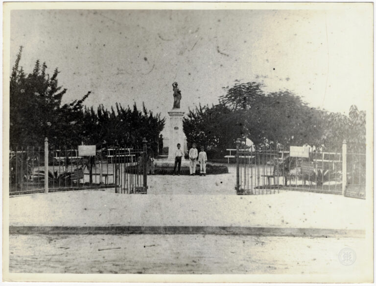 Esta fotografia registra o antigo Jardim da Praia de Fora, em Florianópolis, no ano de 1930. A imagem organiza-se a partir de um plano frontal que apresenta uma...