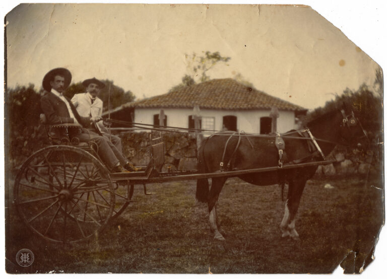by Cleiton Bitencourt Leia Mais...Dois homens em uma carroça tracionada por um cavalo na Fazenda Cruz de Malta, em Lages. Em primeiro plano, a carroça de duas rodas grandes com raios de...