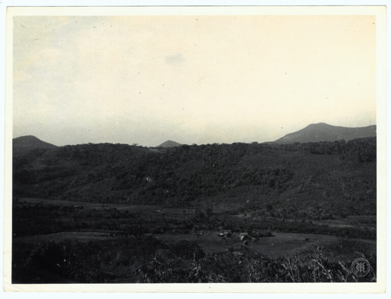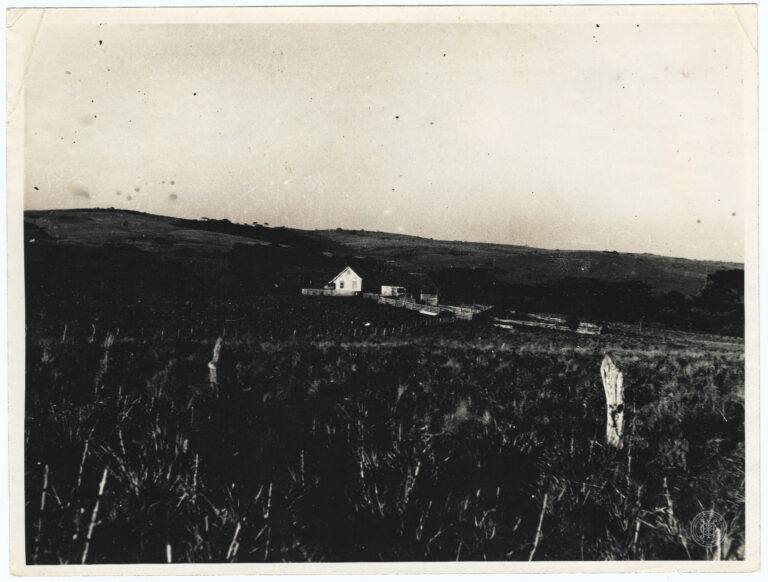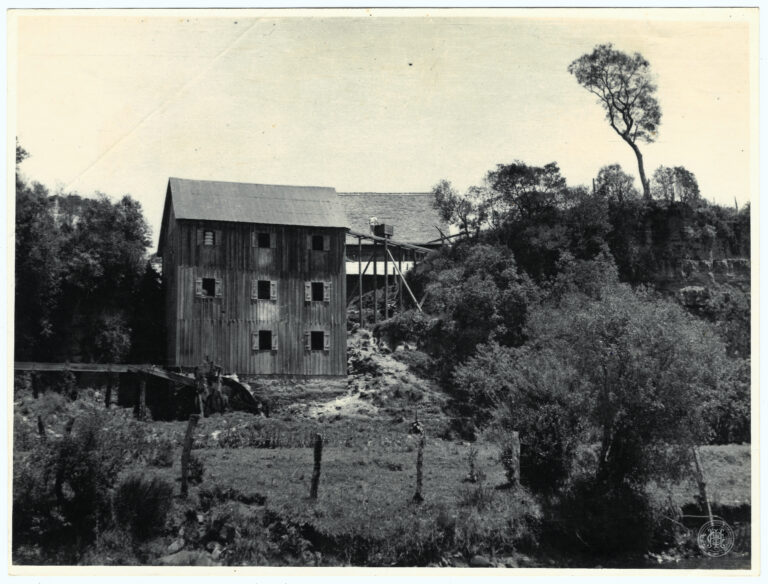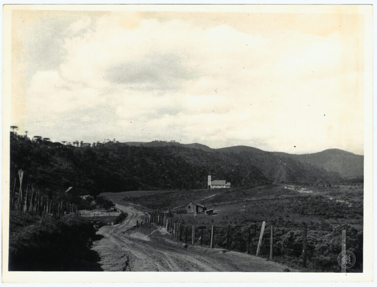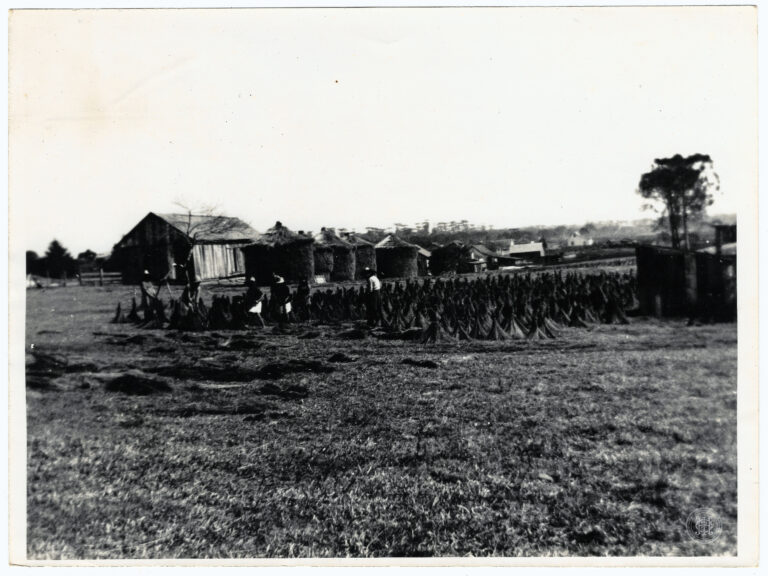Fotografia apresentando uma cena de secagem de produtos agrícolas em uma propriedade rural em Santa Catarina. A composição destaca, no primeiro plano e plano médio, uma vasta área...