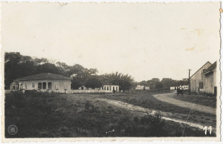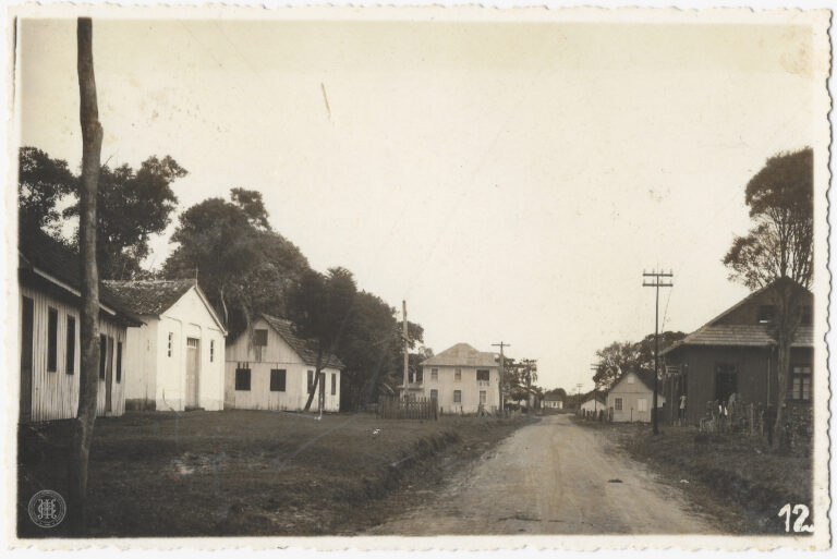 Esta fotografia em tons de sépia, com orientação horizontal e bordas serrilhadas, registra uma vista panorâmica de um logradouro em Araquari, Santa Catarina. Em primeiro plano, observa-se um...