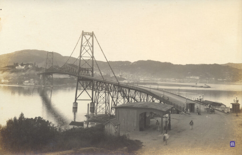 Fotografia histórica em tons de sépia, capturada em plano aberto, apresentando a Ponte Hercílio Luz em Florianópolis. A imagem, registrada na época de sua inauguração em mil novecentos e vinte e seis, destaca a conexão entre o bairro Estreito, no continente, e a Ilha de Santa Catarina, que aparece ao fundo da composição. A ponte pênsil domina o cenário, atravessando diagonalmente o quadro da esquerda para a direita. Suas torres de aço elevam-se contra o céu, sustentando os cabos que desenham uma curva suave sobre o mar. O tabuleiro da ponte estende-se sobre as águas calmas da baía, onde é possível observar o reflexo da estrutura metálica. No primeiro plano, à direita, está a cabeceira da ponte no lado continental. O terreno de chão batido abriga pequenas construções de madeira e vultos de pessoas em movimento. Próximo à entrada da ponte, nota-se uma carroça puxada por cavalos, detalhe que reforça o contexto histórico do transporte no início do século vinte. Ao fundo, a paisagem revela o contorno da Ilha de Santa Catarina, com suas colinas e vegetação rasteira sob uma luz suave. A textura envelhecida da fotografia confere uma aura de nostalgia a este valioso registro do patrimônio catarinense.