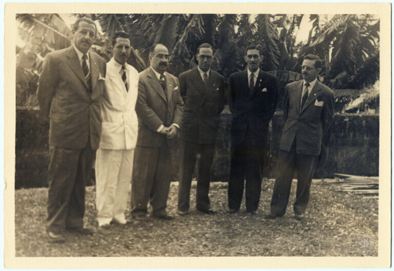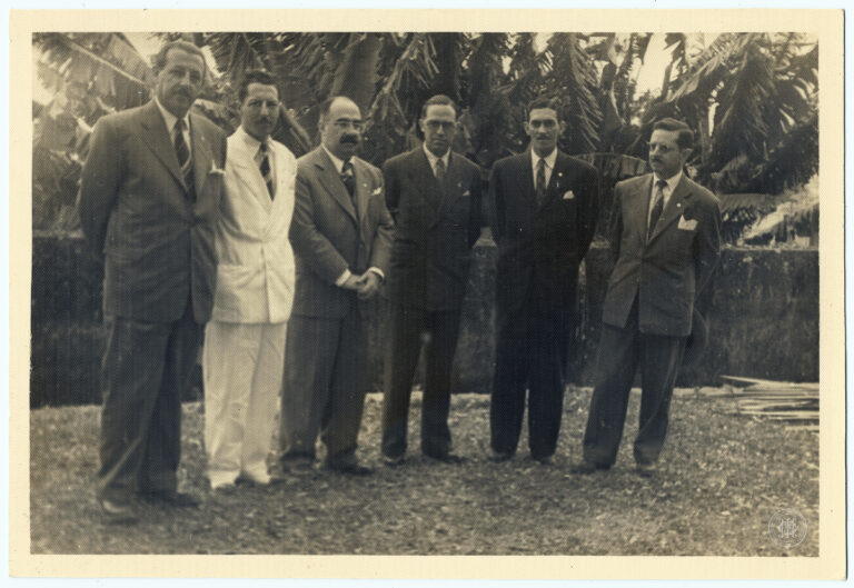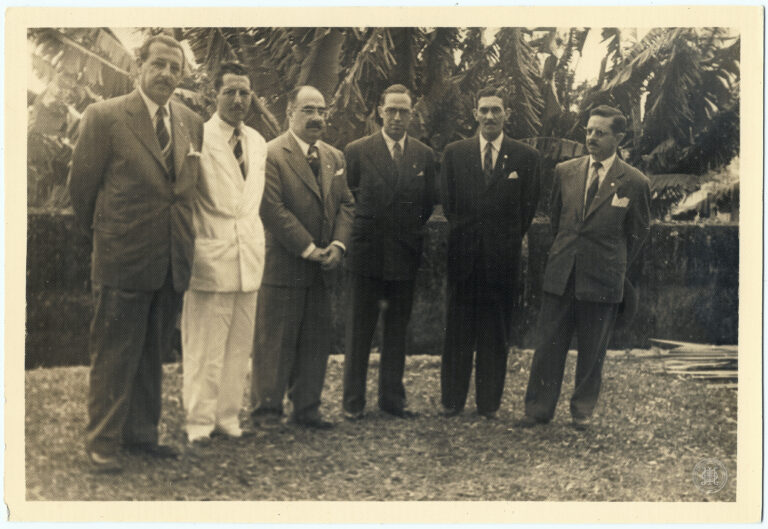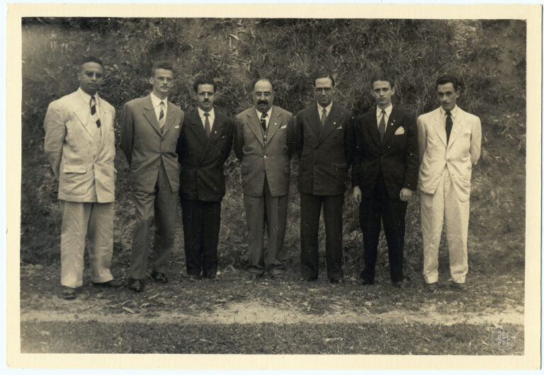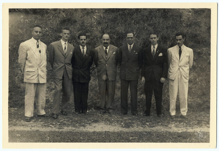 Registra o retrato de dois homens em pé, posados para a câmera em um ambiente externo em Florianópolis, Santa Catarina. O registro ocorre durante o Primeiro Congresso de...