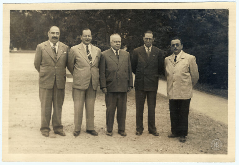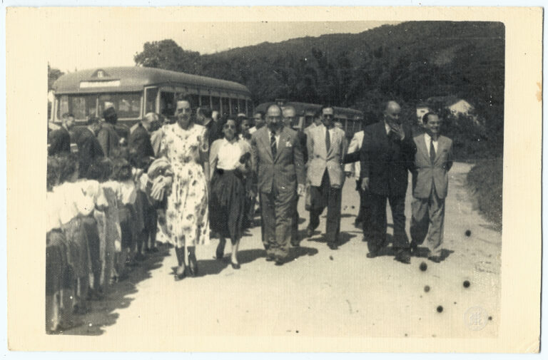 Grupo de pessoas caminhando em uma estrada de terra durante o Primeiro Congresso de História Catarinense, realizado em Florianópolis entre 5 e 12 de outubro de 1948. A...