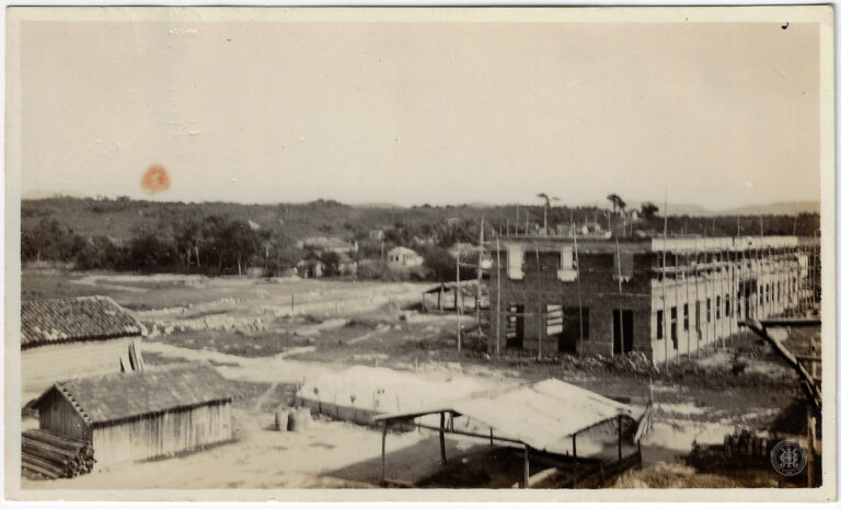 Esta fotografia registra a construção do Pavilhão “A” do 14° Batalhão de Caçadores, atualmente sede do 63° Batalhão de Infantaria, no bairro Estreito, em Florianópolis, Santa Catarina. A...