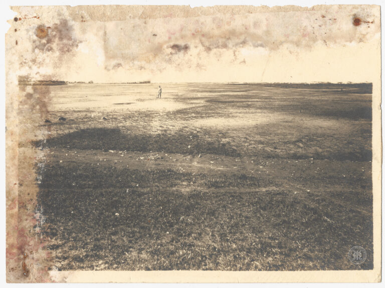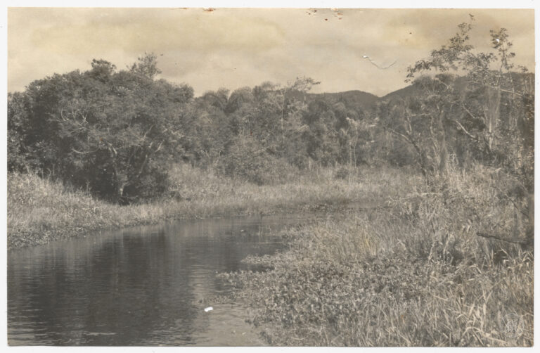 Vista aérea oblíqua da Avenida Bicalho em Laguna, Santa Catarina. A imagem é composta a partir de um plano elevado, revelando em primeiro plano uma encosta com vegetação...