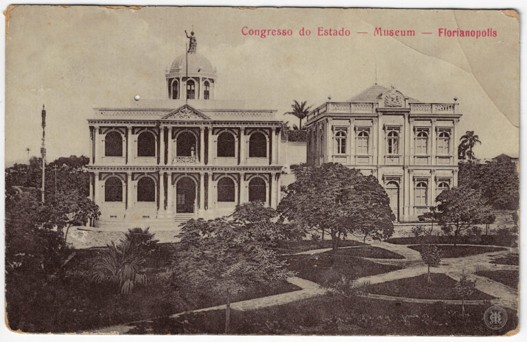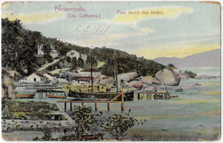 Esta fotografia, em formato de cartão-postal, apresenta uma vista panorâmica elevada da cidade de Florianópolis, então denominada Desterro, no estado de Santa Catarina. No primeiro plano, à direita,...