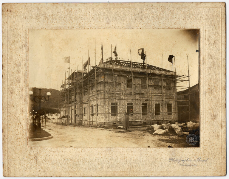 Documenta a construção do Instituto Politécnico na Avenida Hercílio Luz, em Florianópolis, Santa Catarina. A imagem, capturada sob uma perspectiva oblíqua a partir da via pública, destaca o...