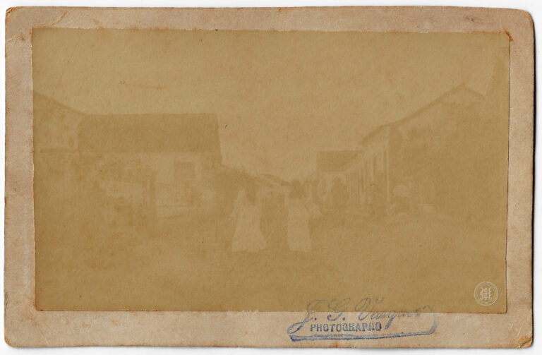 Esta fotografia horizontal em tons de sépia, de baixo contraste e com alto grau de esmaecimento da camada pictórica, registra uma cena urbana em perspectiva central. No primeiro...
