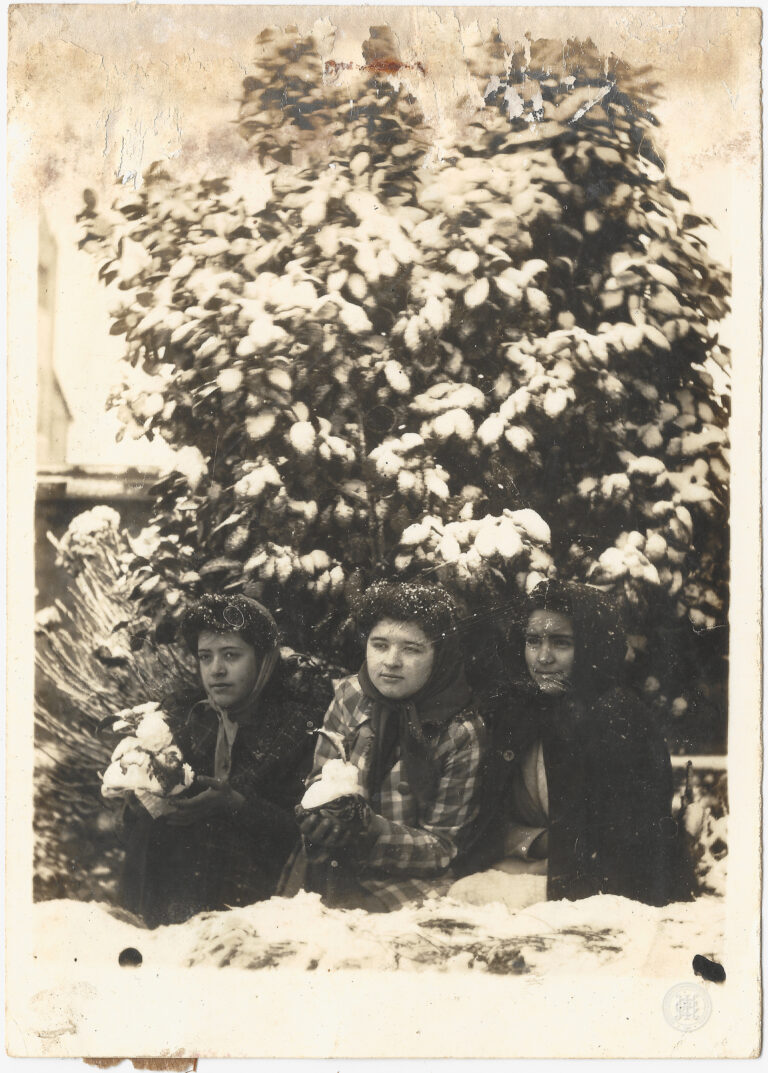 Esta fotografia registra três figuras femininas em meio a uma paisagem com neve no município de Curitibanos, Santa Catarina. Em primeiro plano, uma camada espessa de neve cobre...