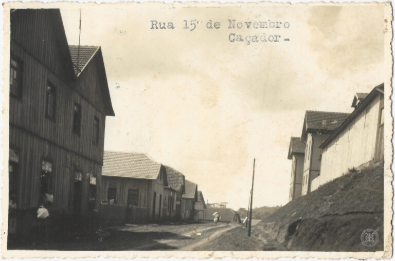 Ponte coberta de madeira sobre o Rio Castelhano, no município de Caçador, Santa Catarina. A estrutura arquitetônica em primeiro plano possui telhado de duas águas e laterais abertas...