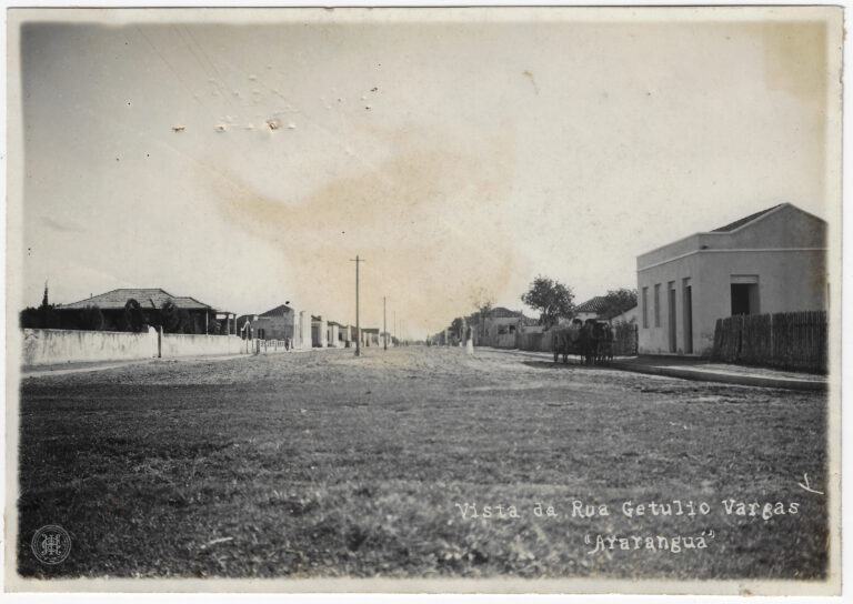 by Leticia Emanuelle Rigo Leia Mais...Esta fotografia em tons de cinza, com orientação horizontal, registra uma perspectiva ampla da Rua Getulio Vargas em Araranguá, Santa Catarina, conforme identificado por legenda sobre a emulsão....